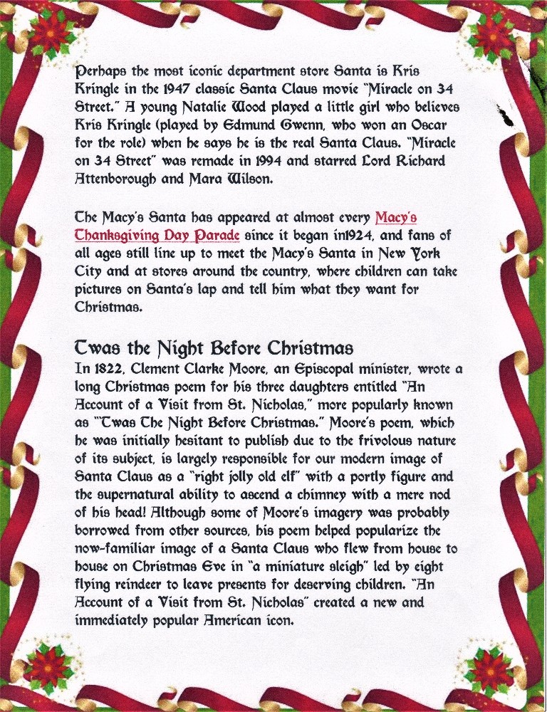 Clement Clarke Moore’s 1823 poem, “A Visit From St. Nicholas,” or more commonly, “’Twas the Night Before Christmas,” cites an original eight tiny reindeer. Owing to his bright, shiny red nose, Rudolph, the most famous reindeer of all, joined the team in 1939, bringing the total number to nine. Rudolph was born of a marketing campaign launched by the Chicago-based department store Montgomery Ward to promote the Holiday season.