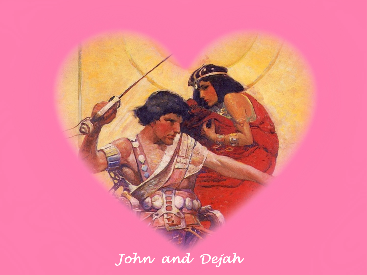 The definitive couple of the classic planetary romance sub-genre, and one of SF’s earliest interplanetary unions, Edgar Rice Burroughs’ hero John Carter describes Dejah Thoris, a princess of Mars—or Barsoom—as “slender,” possessed of a “girlish figure, similar in every detail to the earthly women of my past life… Her face was oval and beautiful in the extreme, her every feature was finely chiseled and exquisite, her eyes large and lustrous and her head surmounted by a mass of coal black, waving hair, caught loosely into a strange yet becoming coiffure. Her skin was of a light reddish copper color, against which the crimson glow of her cheeks and the ruby of her beautifully molded lips shone with a strangely enhancing effect.”