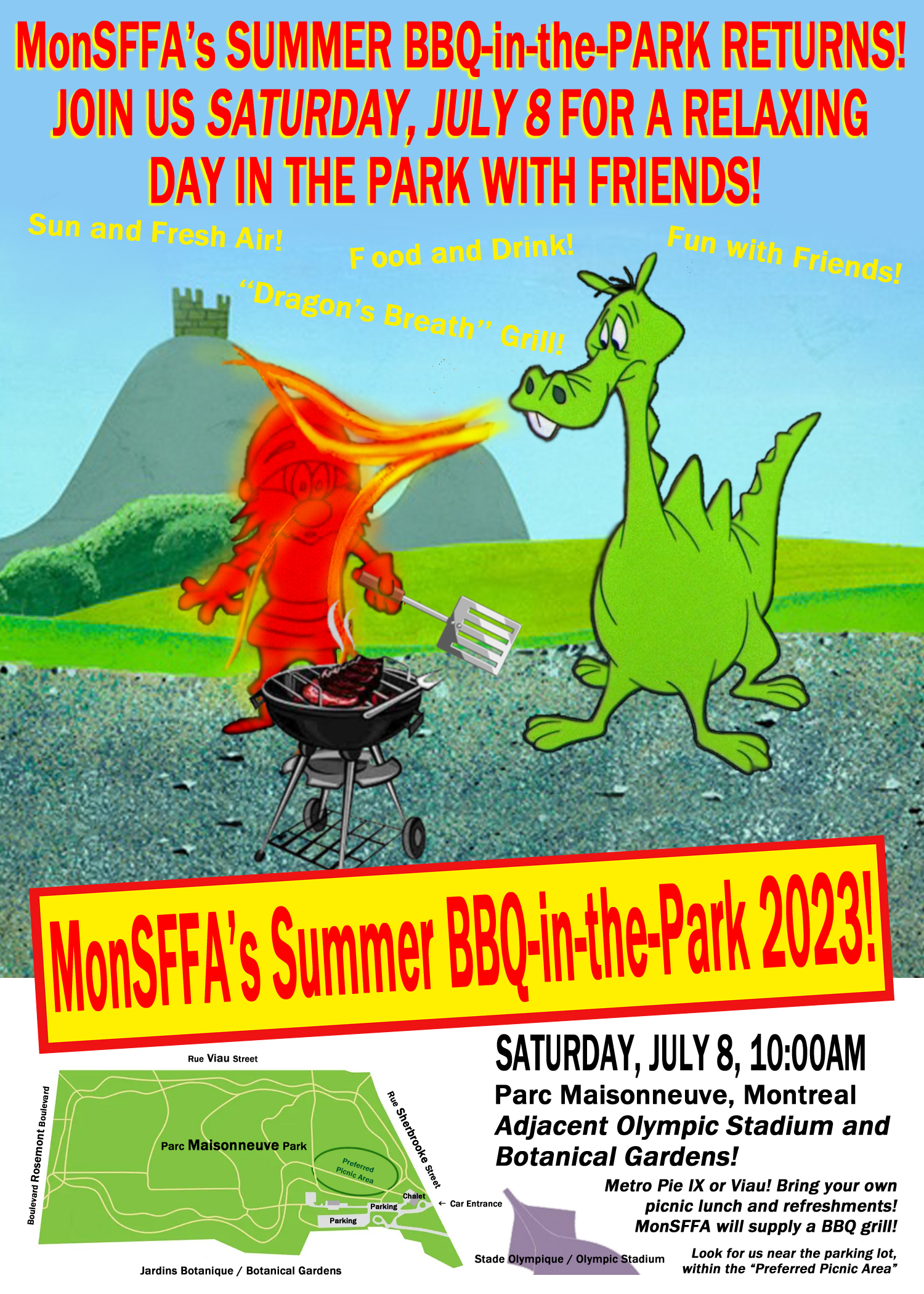 MonSFFen and their families, as well as friends of the club, are invited to gather at Parc Maisonneuve on Saturday, July 8, for the club’s 2023 Barabecue-in-the-Park! Parc Maisonneuve, easily accessible by Metro or bus, is located in the city’s East End, adjacent the Botanical Gardens and the Olympic Stadium. Parking is available on site, or on nearby streets.
