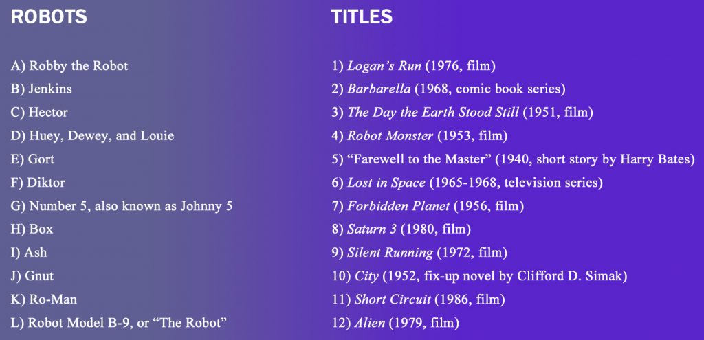 ANSWERS: A-7, Robby the Robot appeared in the classic Forbidden Planet; B-10, robot servant Jenkins attended generations of the Webster family in Clifford D. Simak’s City; C-8, Hector was the homicidal robot in Saturn 3; D-9, Huey, Dewey, and Louie were maintenance drones aboard the Valley Forge in Silent Running; E-3, Police robot Gort appeared in The Day the Earth Stood Still; F-2, Diktor the robot lover appeared in the Barbarella comic books;