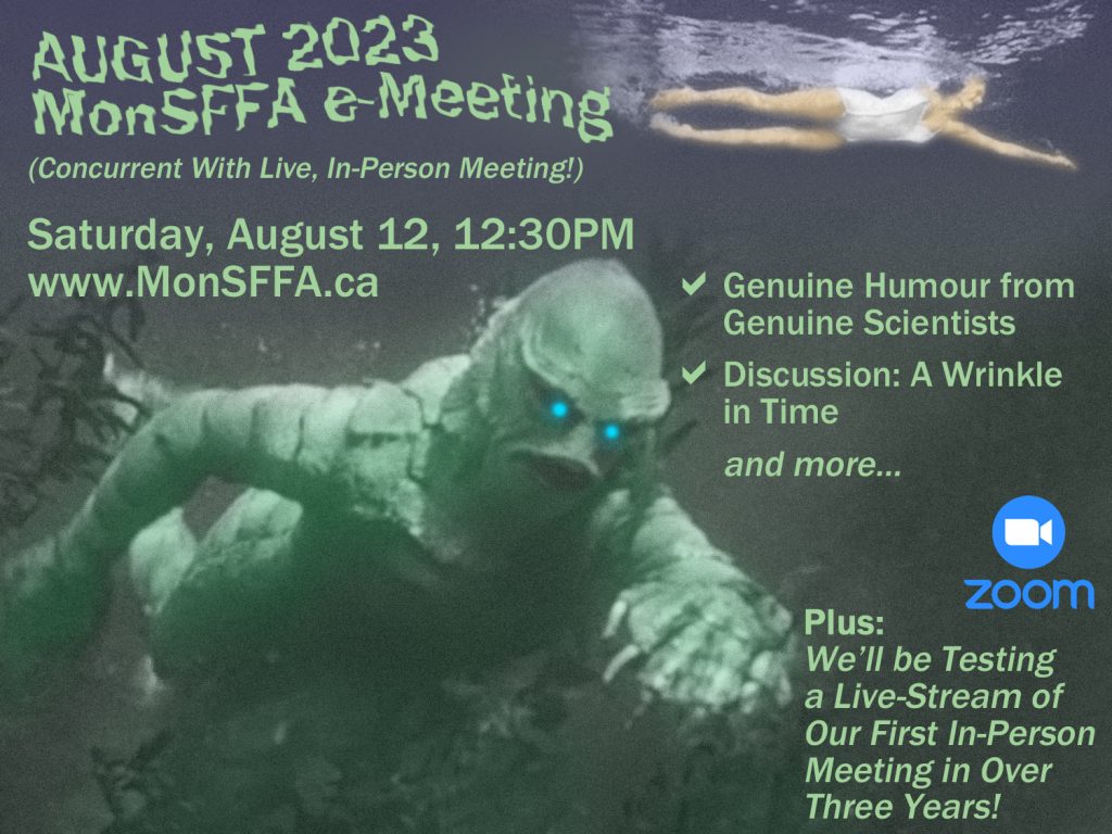 At the same time, we’ll be hosting on ZOOM a parallel e-meeting for the benefit of those out-of-towners among our ranks. This online get-together will serve as a test of the local wifi available to us in our new meeting hall. We hope to enable ZOOMers to join in the fun and ultimately, we hope to establish hybrid MonSFFA meetings, allowing both in-person and virtual participation.