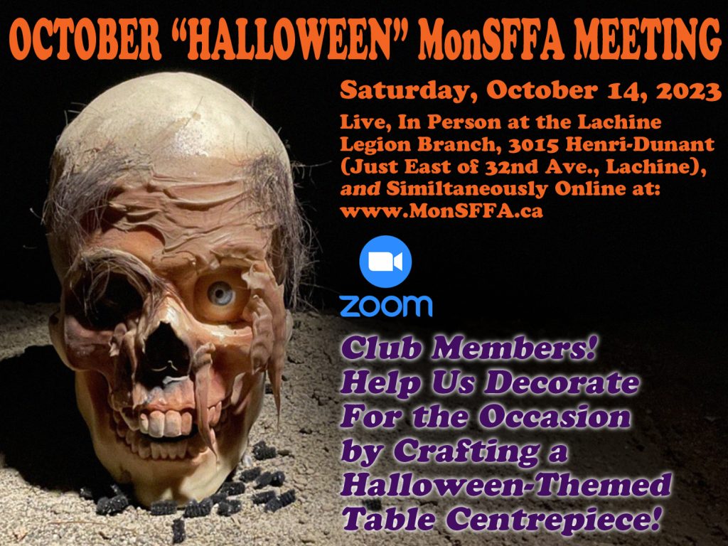 We are tasking club members with the creation of a Halloween-themed table centrepiece—a Jack-o-Lantern, perhaps, a spooky gravestone, cats, bats; use your imagination! And, consider adding something sci-fi to your scary creation!