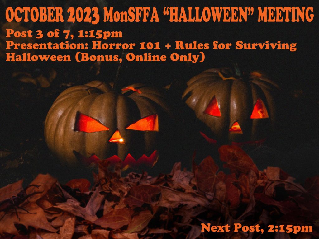 Scroll down afterwards for “online only” bonus content, our Rules for Surviving Halloween, rerunning a feature of our 2020, right-in-the-middle-of-the-pandemic Halloween e-meeting!