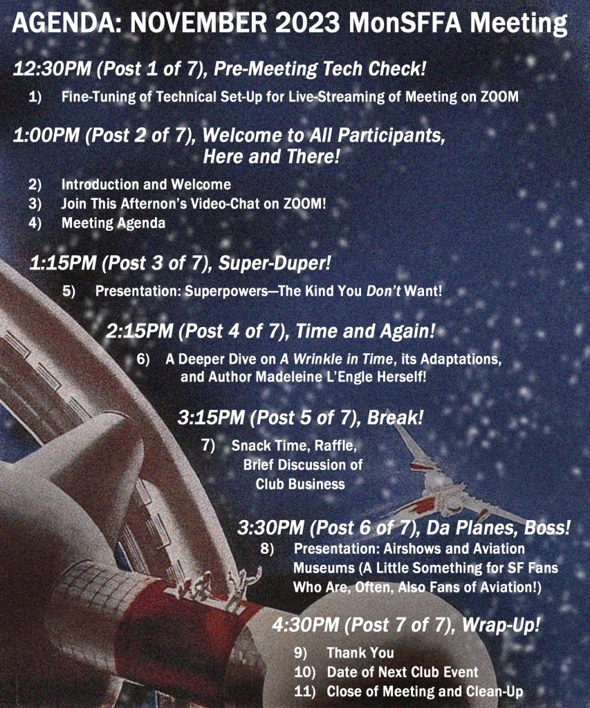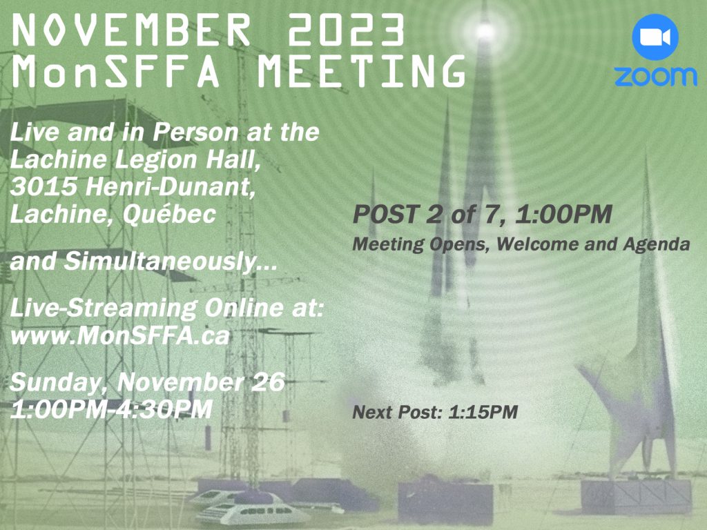 Welcome everyone, both those present here in our meeting hall and those participating from home via ZOOM, to MonSFFA’s November 2023 meeting! This will be our last such gathering of the calendar year—next month will see the club host both a Christmas Luncheon on December 9, and a Holiday ZOOM-Chat on December 17! More about both of these events in our closing post at 4:30PM.