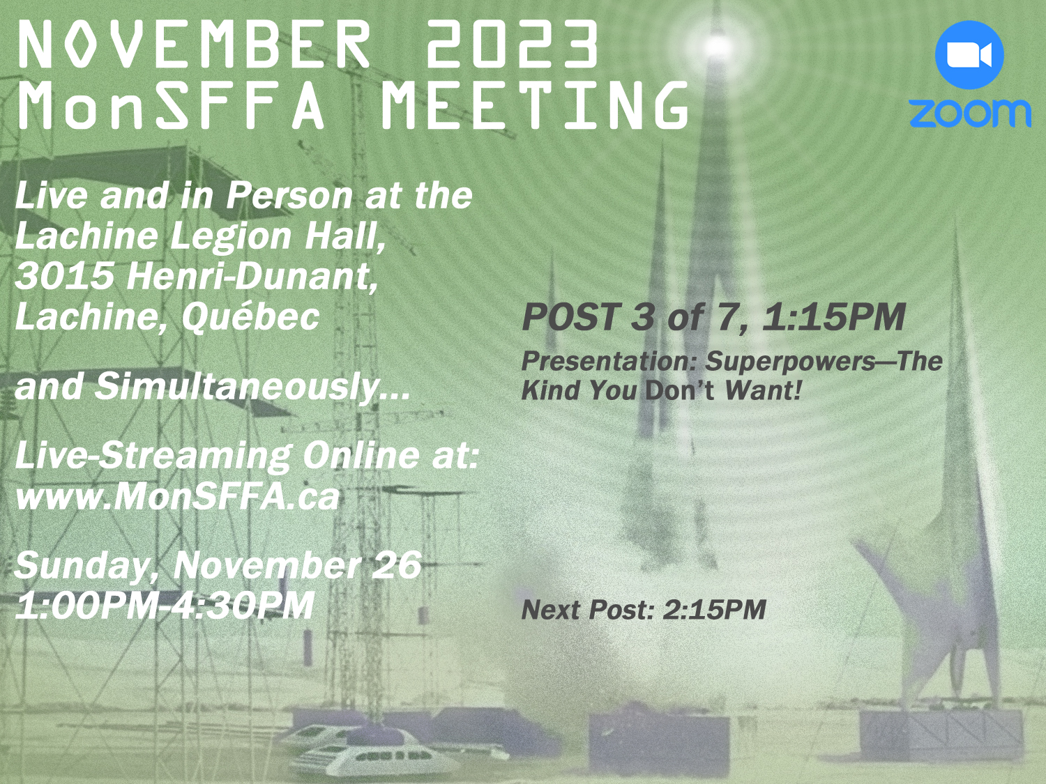 This afternoon’s e-meeting is a continuing experiment. If the local technology is performing properly and all has gone well, you are viewing a live-stream of this MonSFFA meeting, now underway. Those joining us online may follow along, and participate, by way of our ZOOM-chat.