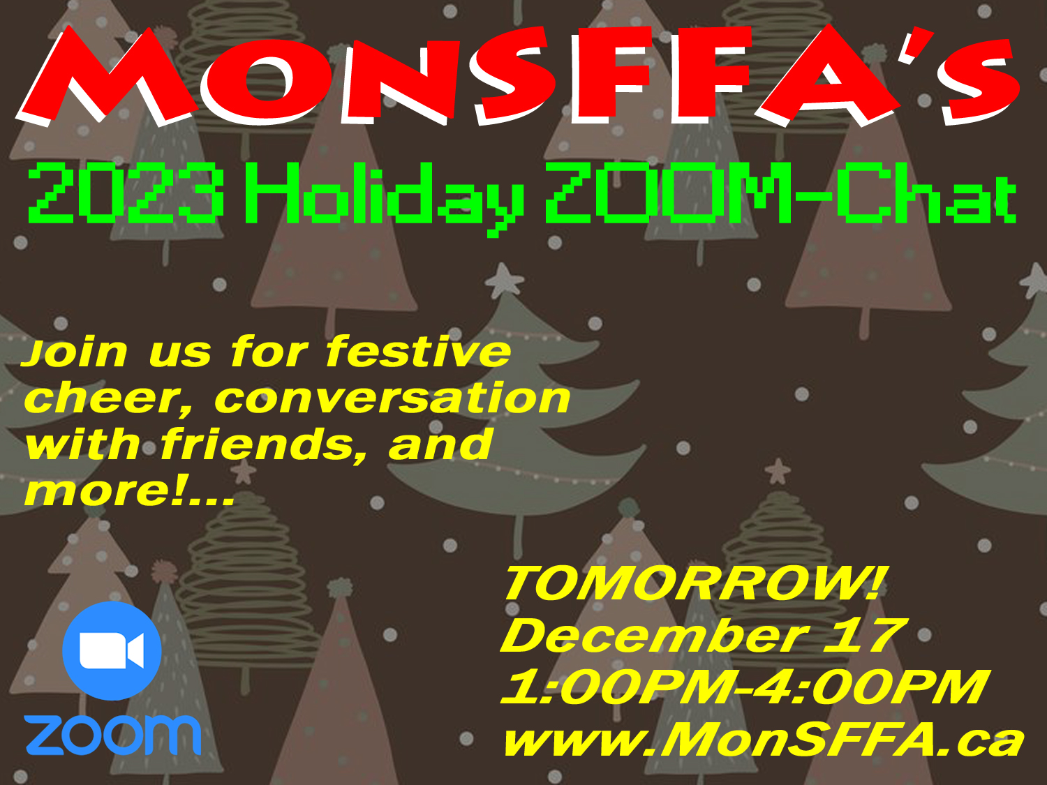 MonSFFA Website MonSFFA’s Holiday ZOOM-Chat is Tomorrow Afternoon! 2023-12-16 Keith Braithwaite Share this: Share on Facebook (Opens in new window) Facebook