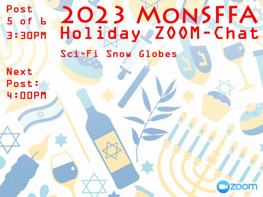 MonSFFA Website 2023 Holiday ZOOM-Chat, POST 5 of 6, 3:30PM: Gallery 2, Sci-Fi Snow Globes! 2023-12-17 Keith Braithwaite 7) GALLERY 2 Here, we rerun an image gallery featuring SF/F-themed snow globes that originally appeared as part of our November 2022 e-meeting. Enjoy again, and no shaking the globes! Share this: Share on Facebook (Opens in new window) Facebook