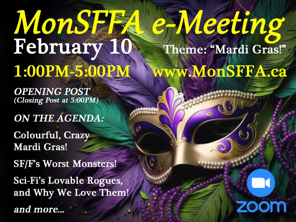 Welcome to MonSFFA’s February 2024 meeting! This afternoon’s proceedings are soon to get underway. Our Lachine Legion meeting hall booking for this month remains unconfirmed at this time, unfortunately, so we will be getting together exclusively on ZOOM, today! See the instructions, below (at the end of this post), to join us online and participate.
