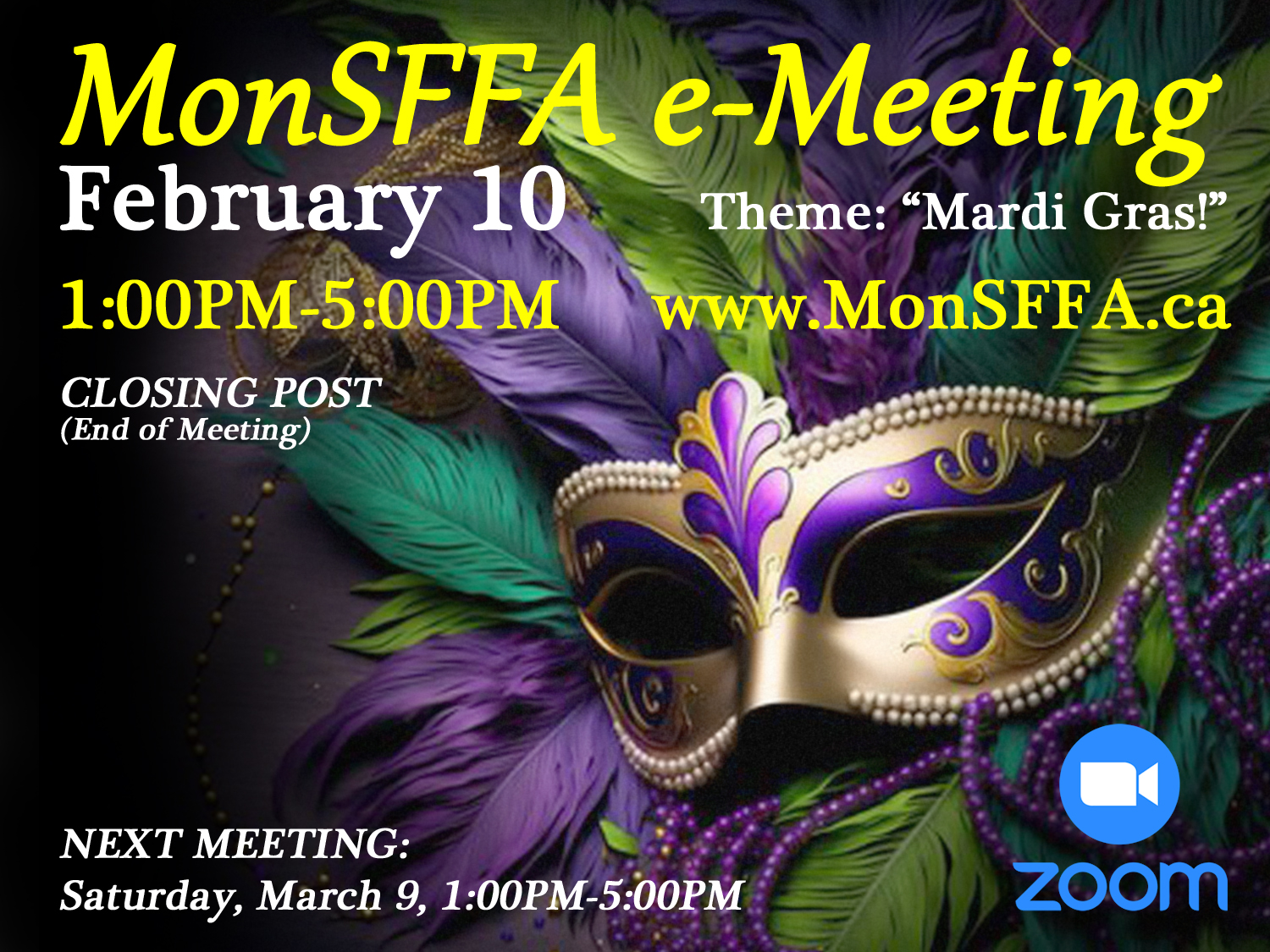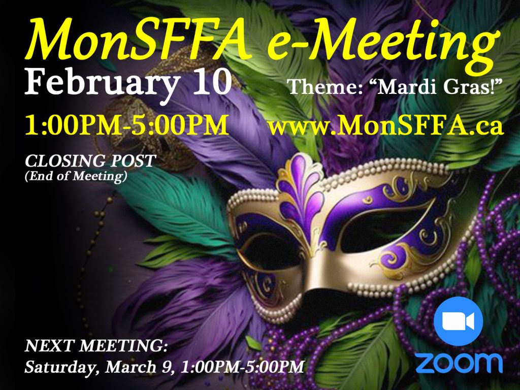 MonSFFA meets again on Saturday, March 10, from 1:00PM to 5:00PM. Details will be forthcoming; check in with us at www.MonSFFA.ca for updates, the next issue of our club news bulleting, Impulse, and for additional content.