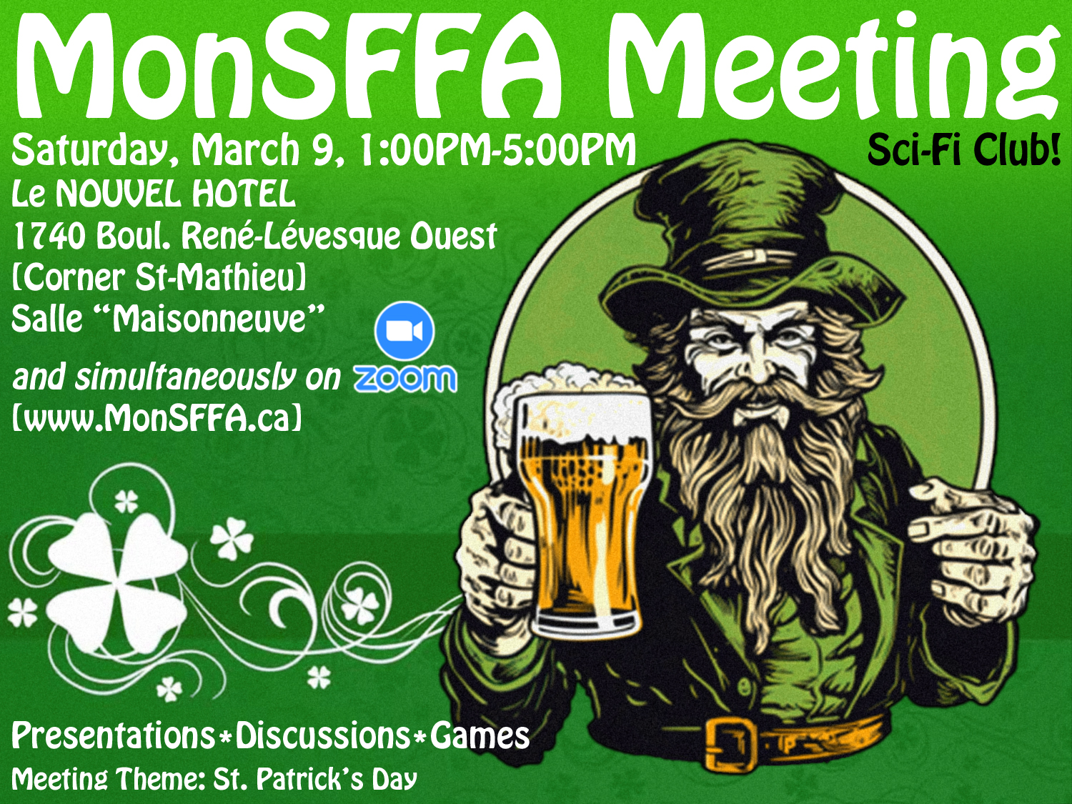 Meeting Theme: Our March 2024 meeting precedes St. Patrick’s Day by about a week. The city’s Irish heritage has long been a part of Montreal’s cultural mosaic. MonSFFen are encouraged to wear something green to the meeting, perhaps a shamrock!