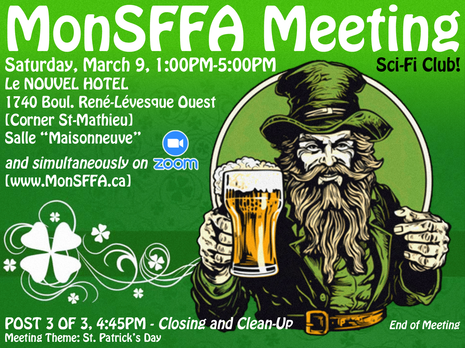 MonSFFA meets again on Saturday, April 13, from 1:00PM to 5:00PM. Details will be forthcoming; check in with us at www.MonSFFA.ca for updates, the next issue of our club news bulleting, Impulse, and for additional content.