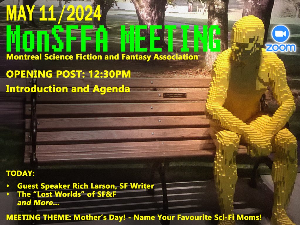 Welcome to MonSFFA’s May 11, 2024 meeting! This afternoon’s proceedings are soon to get underway. We are meeting live and in person at our new meeting hall in the Nouvel Hotel, downtown! For those joining us online, today, see the instructions, below (at the end of this post), to join in and participate on ZOOM.