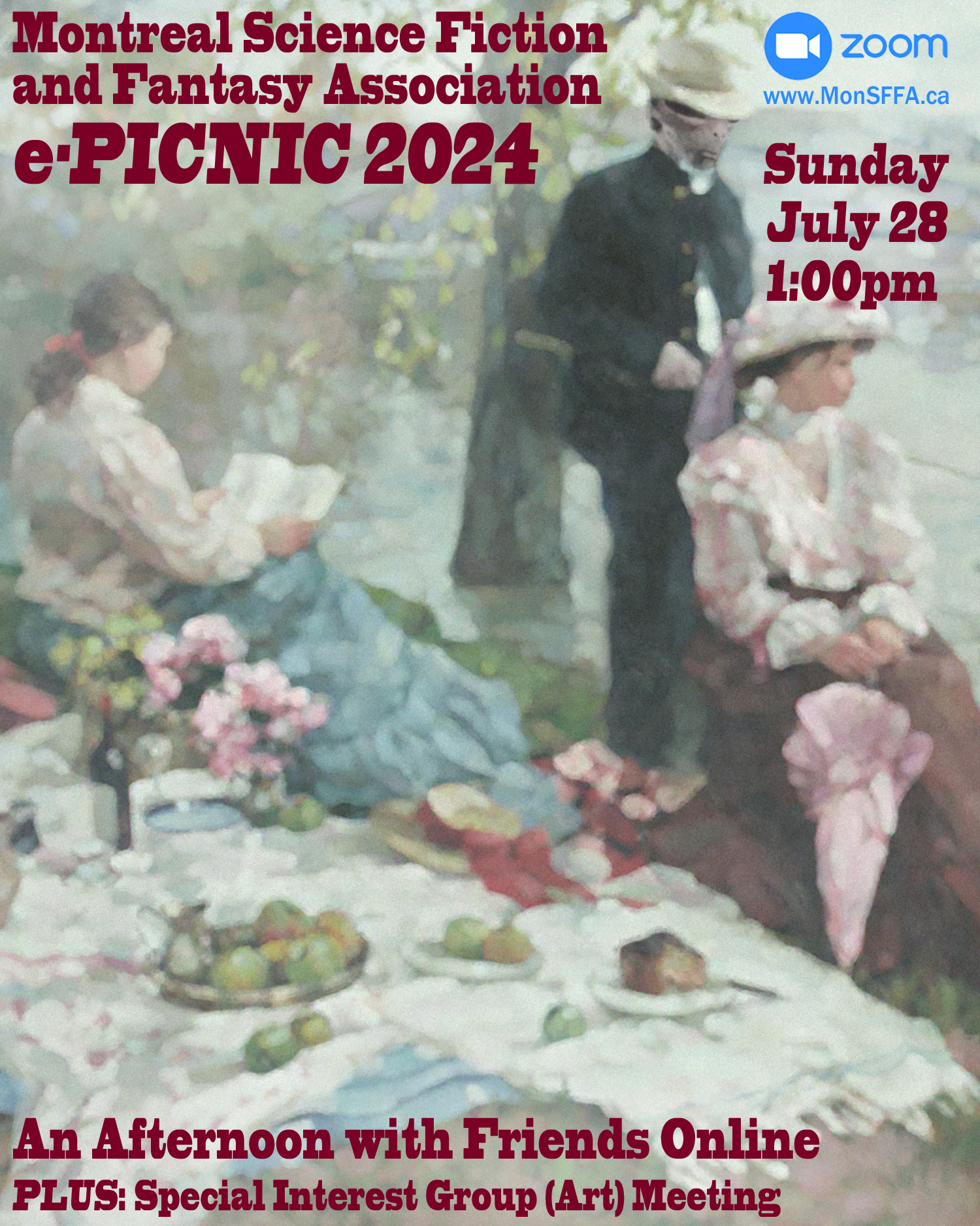 We will also host an “e-Picnic” via ZOOM (www.MonSFFA.ca) on Sunday, July 28, beginning at 1:00PM—have your favourite summer snacks and libations on hand!