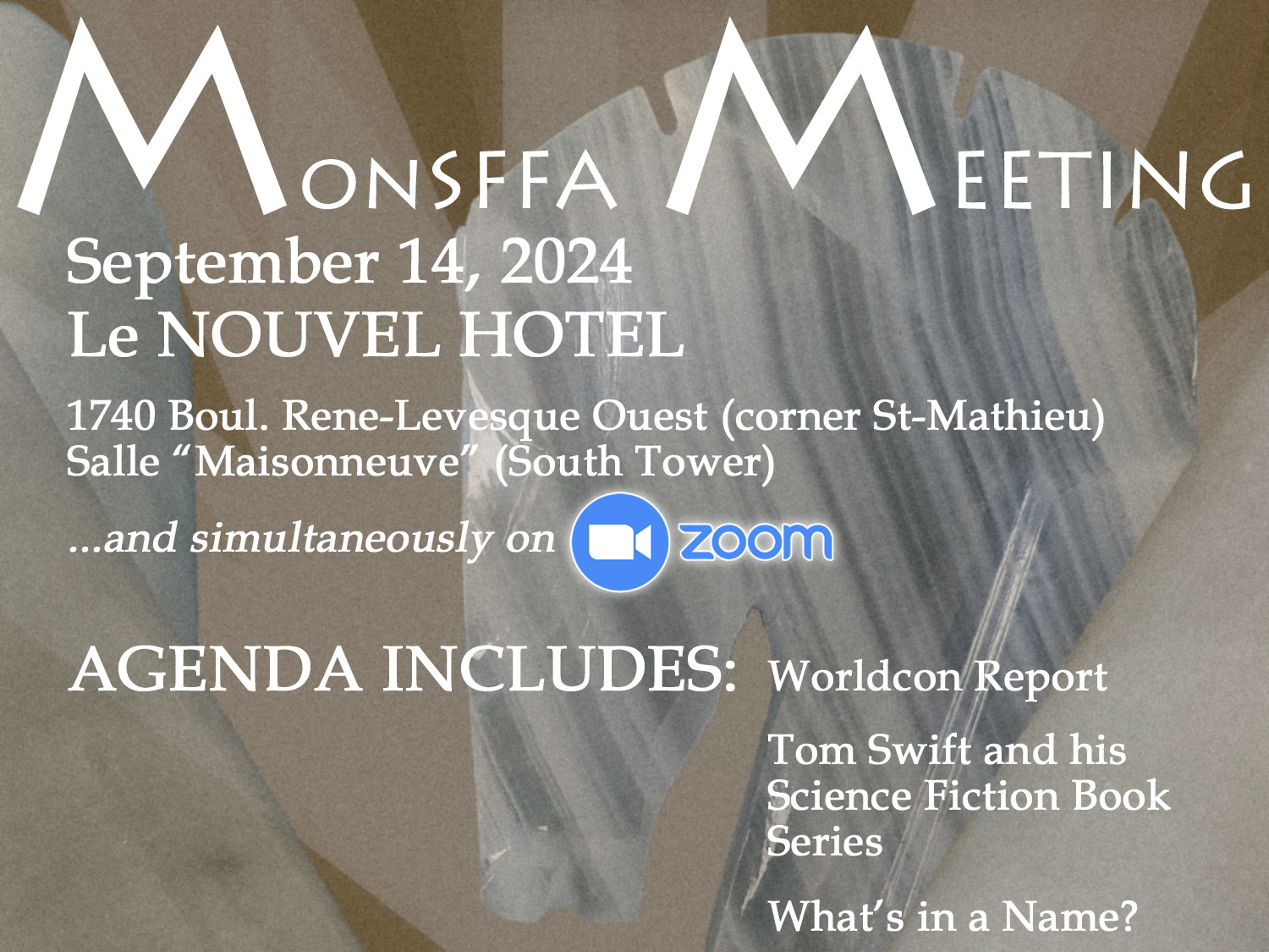 MonSFFA’s next regular meeting is scheduled for tomorrow, Saturday, September 14! We are meeting in our usual hall, “Salle Maisonneuve,” at Le Nouvel Hotel! Le Nouvel is located on a major bus line, and is just a short walk from either Metro Guy/Concordia or Lucien-L’Allier.