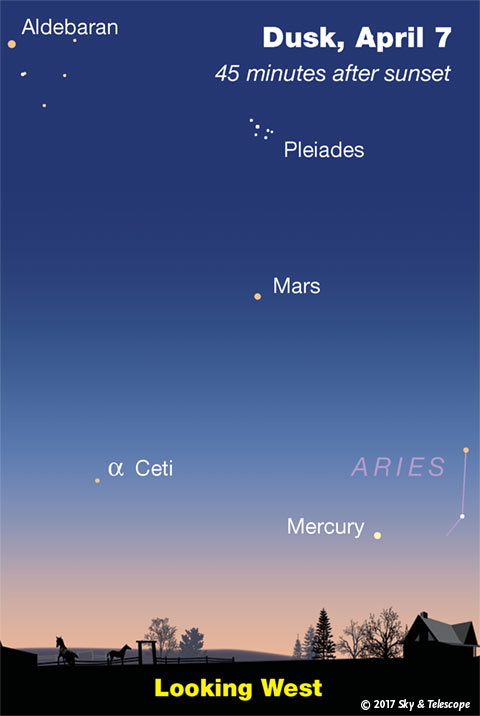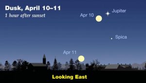 Jupiter (magnitude –2.5, in Virgo) comes to opposition on April 7th. It rises around sunset, shines low in the east-southeast after nightfall, high in