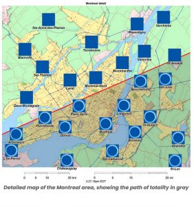 There is a small margin of error in the maps along the edges of the path of totality. Try to be closer to the centre, you wouldn’t want to miss this event by being a block too far away! If you are willing to travel, the best viewing, ie longest duration of totality, will be in the Eastern Townships.